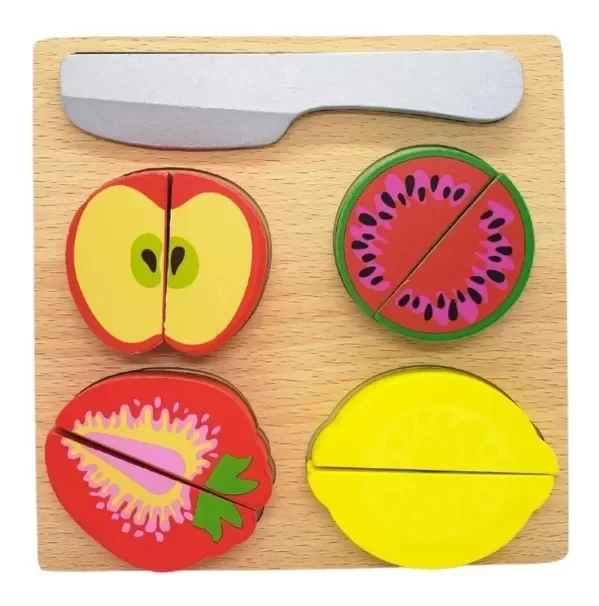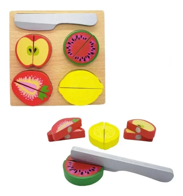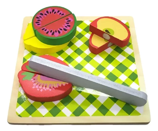 Este juguete didáctico incluye un cuchillo de madera y 4 piezas que se pueden cortar a la mitad y volver a unir con abrojos. Ideal para los más chiquitos, les ayudará a aprender mientras juegan y estimulan su imaginación.
